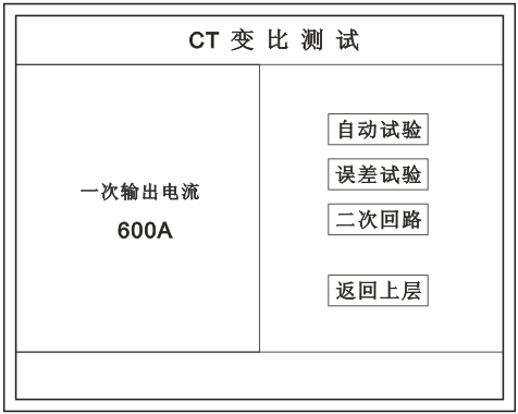 在主菜單界面,旋轉(zhuǎn)鼠標(biāo)將光標(biāo)移動(dòng)到 CT測(cè)試 選項(xiàng)上,按下旋轉(zhuǎn)鼠標(biāo)選擇 CT變比 即可進(jìn)入變比極性試驗(yàn)設(shè)置界面(如下圖)。光標(biāo)移動(dòng)至 返回上層 ,按下鼠標(biāo)即可返回主菜單。