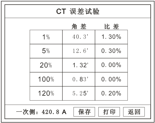 按額定一次的:1%、5%、20%、100%、120%取值,同時(shí)顯示出角差與比差。