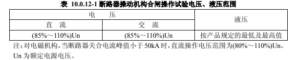 1)當操作電壓、液壓在表 10.0.12-1 范圍內(nèi)時,操動機構(gòu)應(yīng)可靠動作