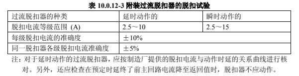 3)附裝過流脫扣器的,其額定電流規(guī)定不小于 2.5A,脫扣電流的等級范圍及其準確度,應(yīng)符合表 10.0.12-3 的規(guī)定。
