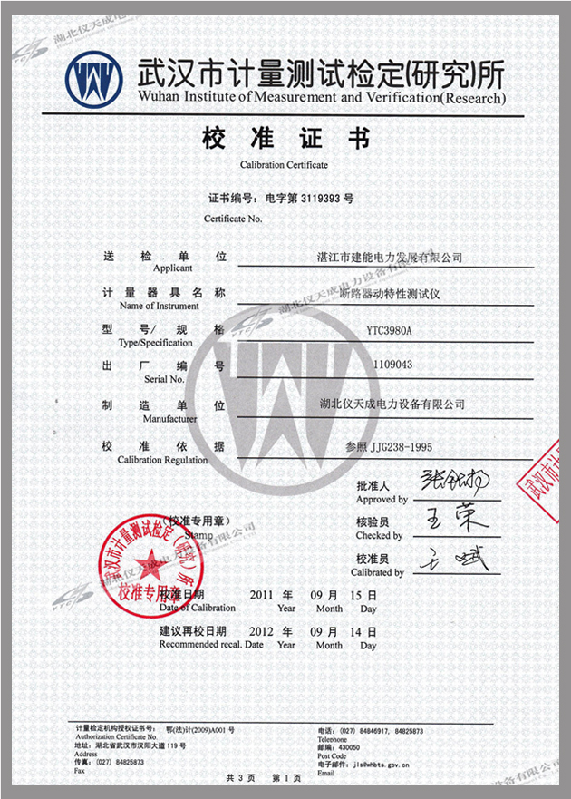 轉載:"3980A斷路器動特性分析儀鑒定證書" 請注明來源于儀天成電力。 更多技術問題請致電儀天成電力客戶服務:027-87876585,技術部專線:027-87876585,在線客服:719388481
